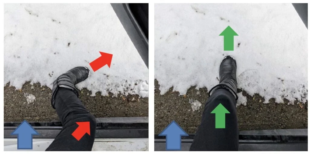 - When exiting, consider your body mechanics! Align the knee and foot (this is where lots of people have twisted their knees) by making sure your hips are moving the same direction your toes are pointing.