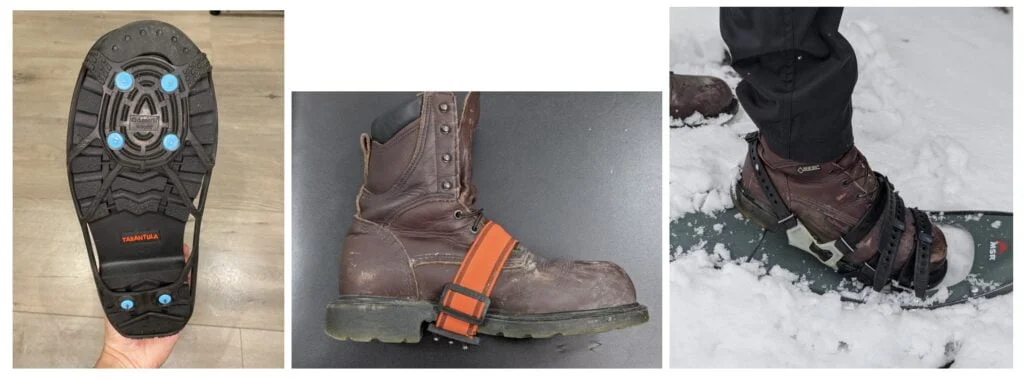 - Additional equipment and gear may benefit us as well, such as the use of hiking poles, traction aids, boot liners, etc. Boot liners can not only help to keep our feet warmer and dryer, they can also fill space gaps that we have in larger footwear, providing a more snug fit overall. Traction aids can come in many different options. We commonly see people utilize the rubberized versions that wrap around the soles of the shoes, or the simpler elastic bands that fill the centre of the sole. The first is often a better option for consistent outdoor walking with better overall grip, the latter is more flexible for those moving between indoor and outdoor environments but less grip. Snowshoes have a lifter that angles the snowshoe, making it much easier on the ankles when hiking uphill.